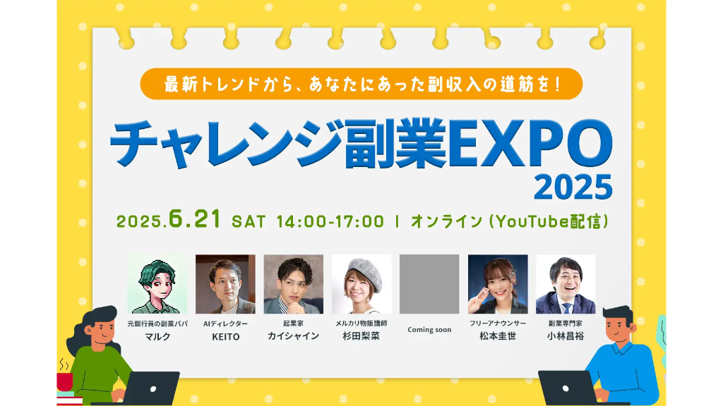 2025年6月21日(土)、株式会社レベクリ主催によるオンラインイベント「チャレンジ副業EXPO2025」を開催いたしました。 このイベントでは、副業に関する知識を提供するインフルエンサーや専門家をお招きし、最新トレンドや複数の副業モデルについて学べる...